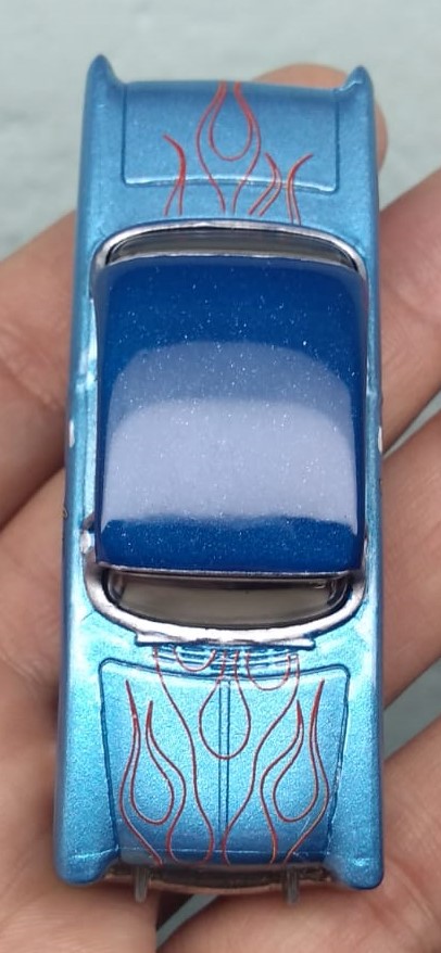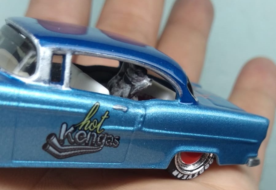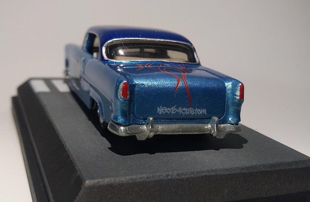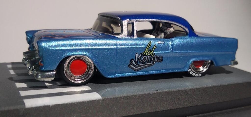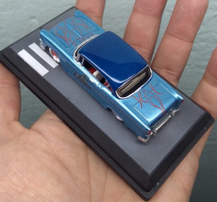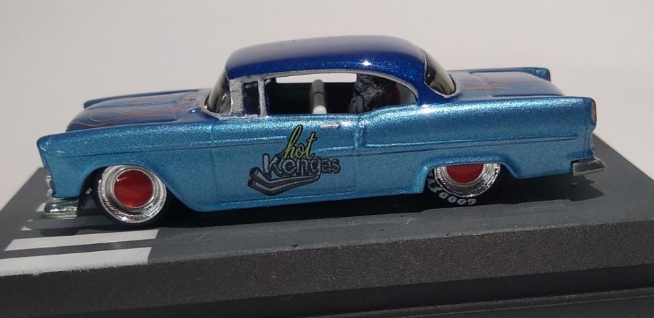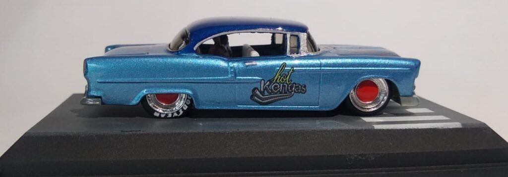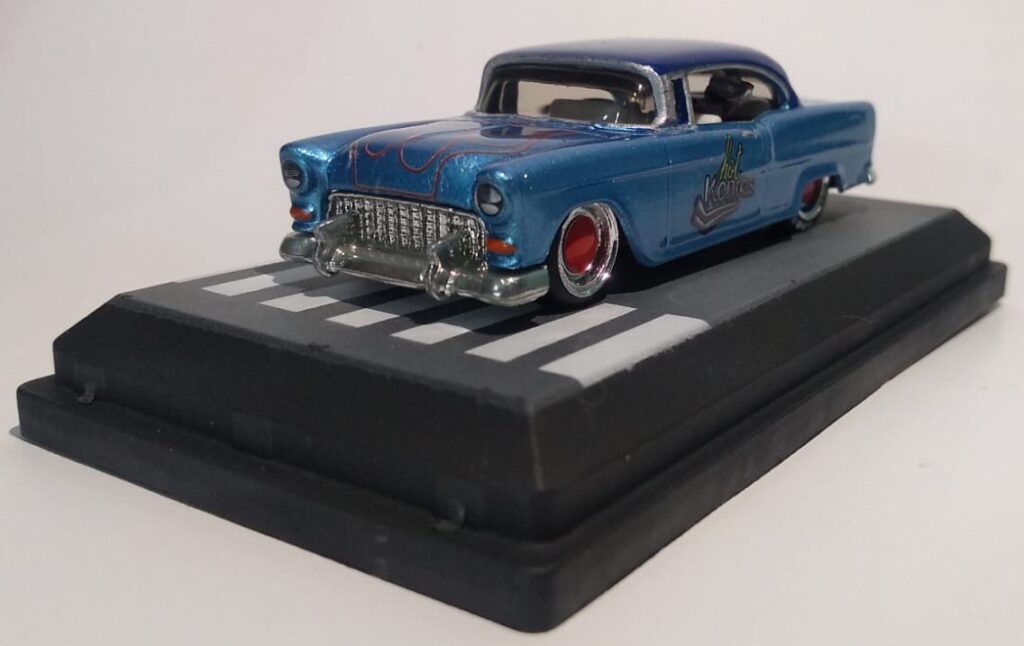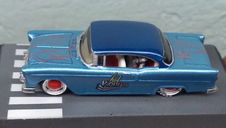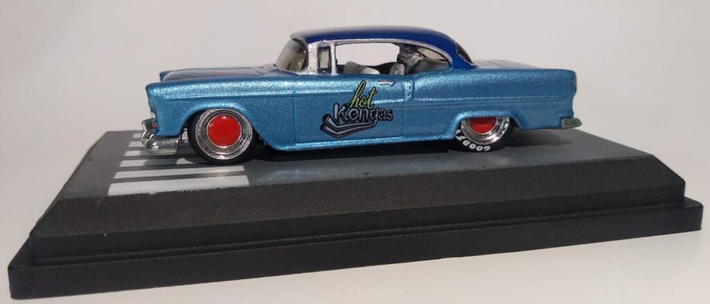 O Modelo 55 Chevy Hot Kengas chega com a sua suspensão rebaixada, mas não ficou agressivo, mas este detalhe aliado a sua pintura metálica com acabamento em verniz automotivo e com aplique de flakes deixou o modelo muito charmoso.