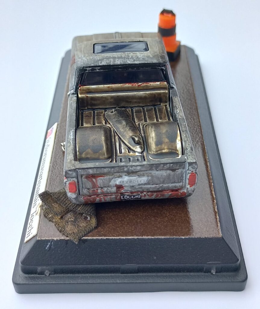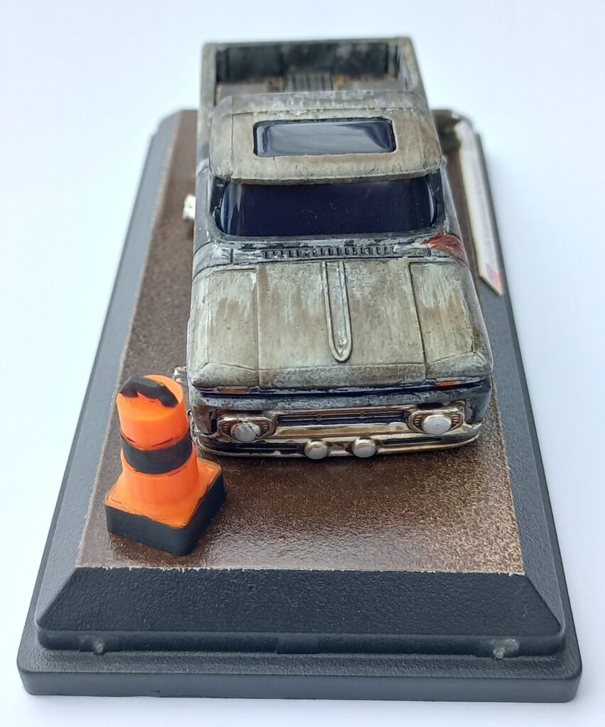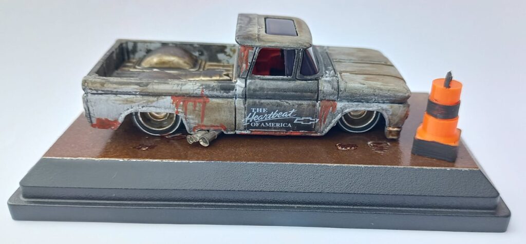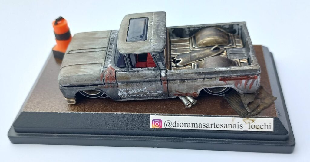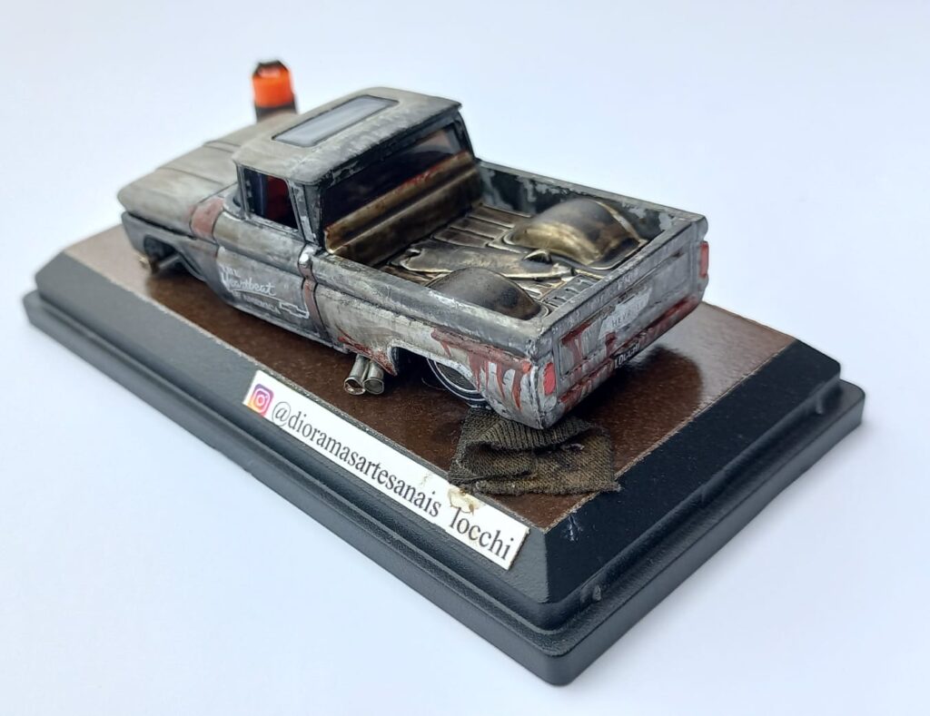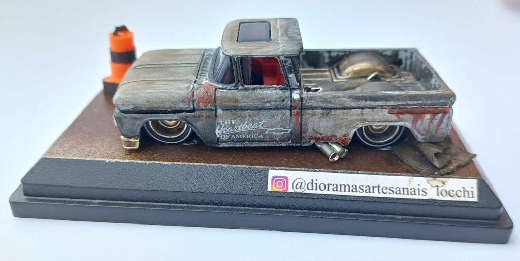 Pick-up Customizada em estilo RUSTY ENVELHECIDO, Pintura PVA FOSCO A BASE D’AGUA, toda a aplicação feita utilizando o Pincel, iniciando a partir do Prime a Carroceria recebe algumas camadas sobrepostas de tintas começando pela Marrom, passando pela Laranja e finalizando com a preta e assim chegando ai acabamento final.