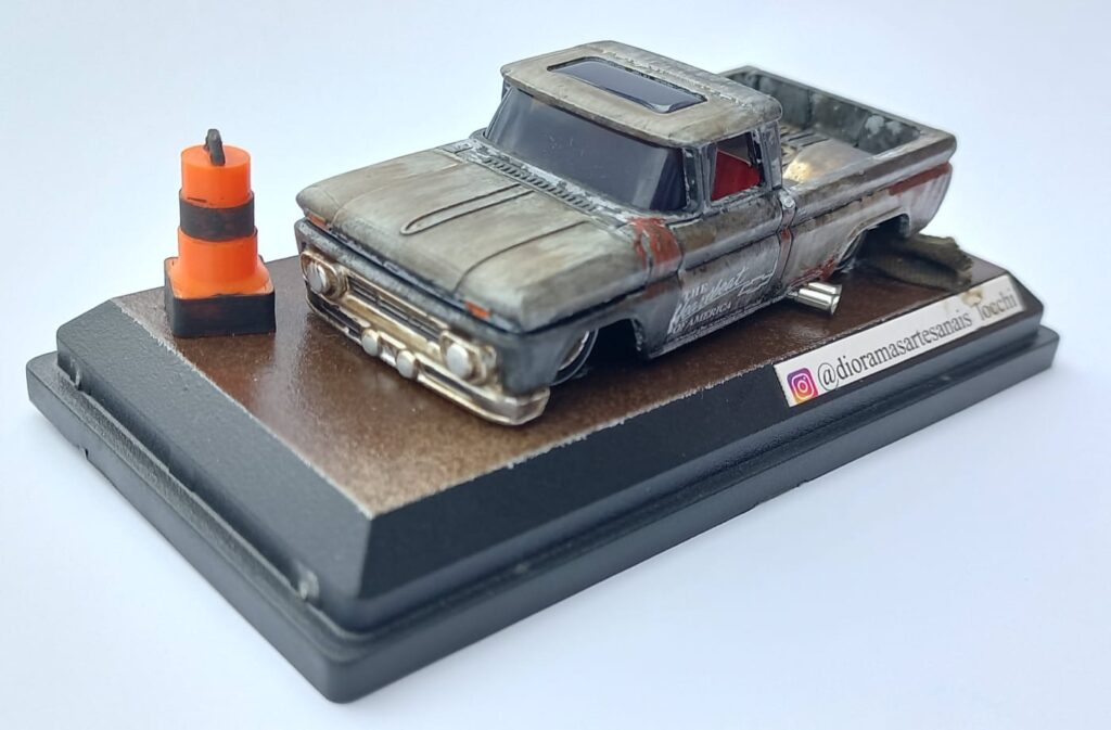 Nesta matéria vamos apresentar um trabalho que utilizou o modelo de Pick-up acima, modelo esse que estreou no Casting Hot Wheels no ano de 2008 na Série Básica Hot Wheels dentro da Sub-Série New Models e em 2017 sofreu uma alteração onde perde a prancha que vinha como um acessório, sendo alterada em sua caçamba que teve uma mini prancha inserida como parte do assoalho da nova caçamba, tanto uma versão quanto a outra, ambas na escala 1/64 foram criações do Designer Hot Wheels ROB MATTHES, o nosso personagem emprestou todo o seu talento e criou esta versão sensacional que também fará parte da RIFA SEMANAL DA KUSTOM KRUISER desta semana, aliás já estão liberados os números no Instagram do grupo, aqueles que quiserem comprar um número e ter a chance de escolher entre as três opções se for o sorteado, é só acessar o link à seguir https://www.instagram.com/p/CoQkrd3OO84/?igshid=NDdhMjNiZDg=