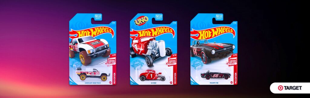 Como acontece todos os anos, foi divulgado mais um MIX, desta vez o “D” da Hot Wheels Series Target Red Edition 2021, são 03 (três) modelos em versões básicas com vários detalhes na cor vermelha, que é a cor tradicional das Lojas Target, uma das redes de varejo mais tradicionais dos EUA.