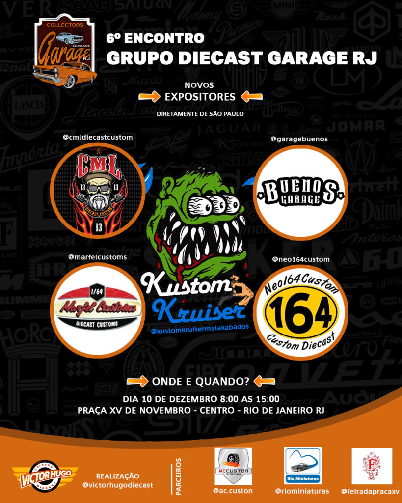 Para o evento do Rio de Janeiro, Diecast Garage RJ irão o Carlos Magno de Lima Antunes da CML DIECAST CUSTOM e GABRIELA TOYS, Nelson de Moraes Pereira da NEO164CUSTOM, Felipe do Monte Pereira da MARFEL CUSTOMS e o Bruno Leonardo de Souza Bueno da GARAGE BUENO’S representando a KUSTOM KRUISER.