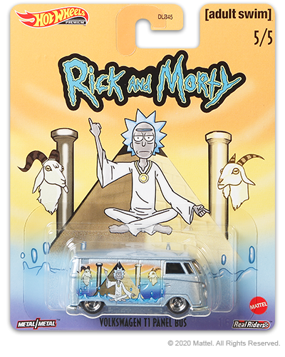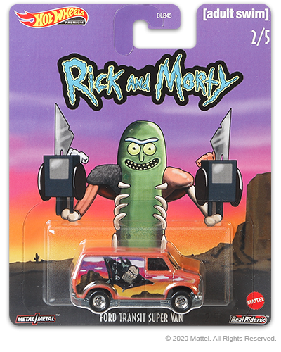 Este Lote é formado por 5 modelos com a comunicação visual desta animação adulta americana Rick and Morty, todos os modelos em Metal, Pneus de Borracha, Rodas Especiais Real Riders e Decorações características da série animada.