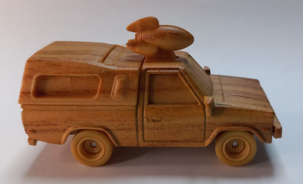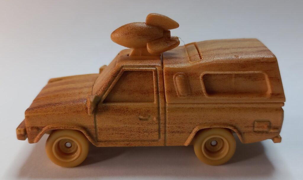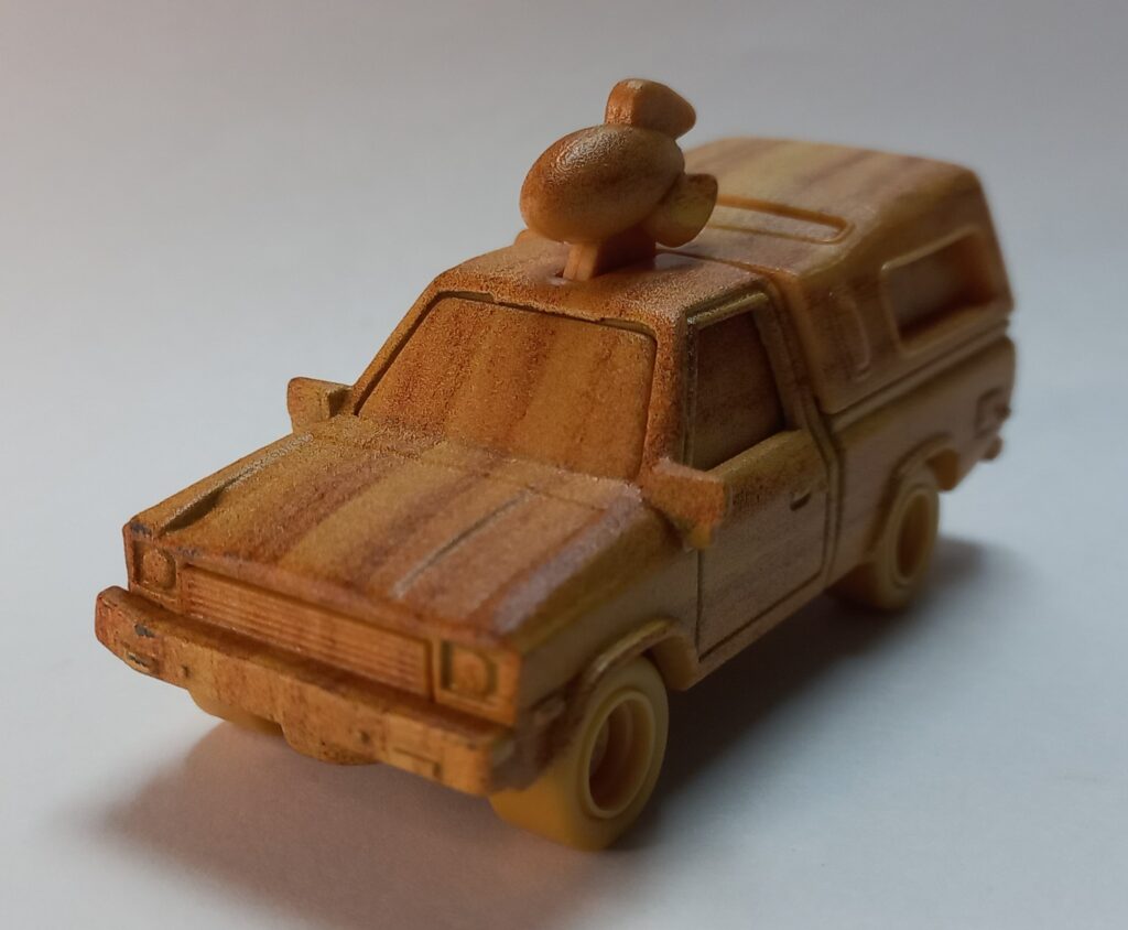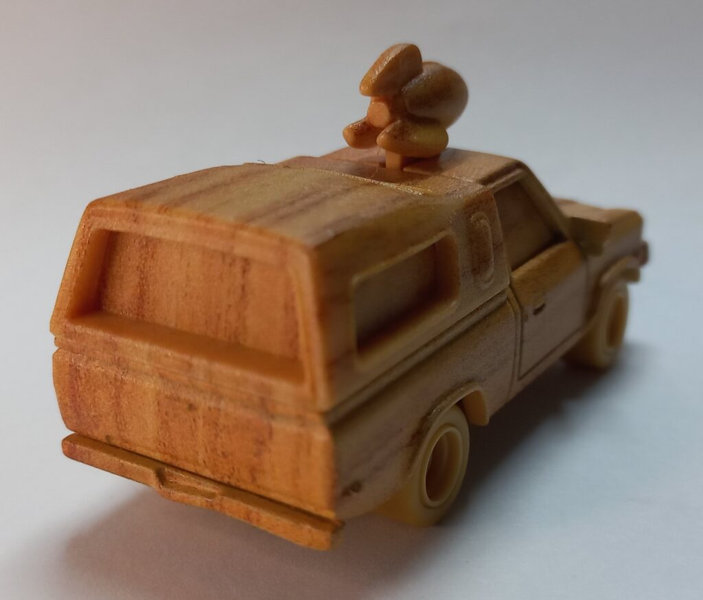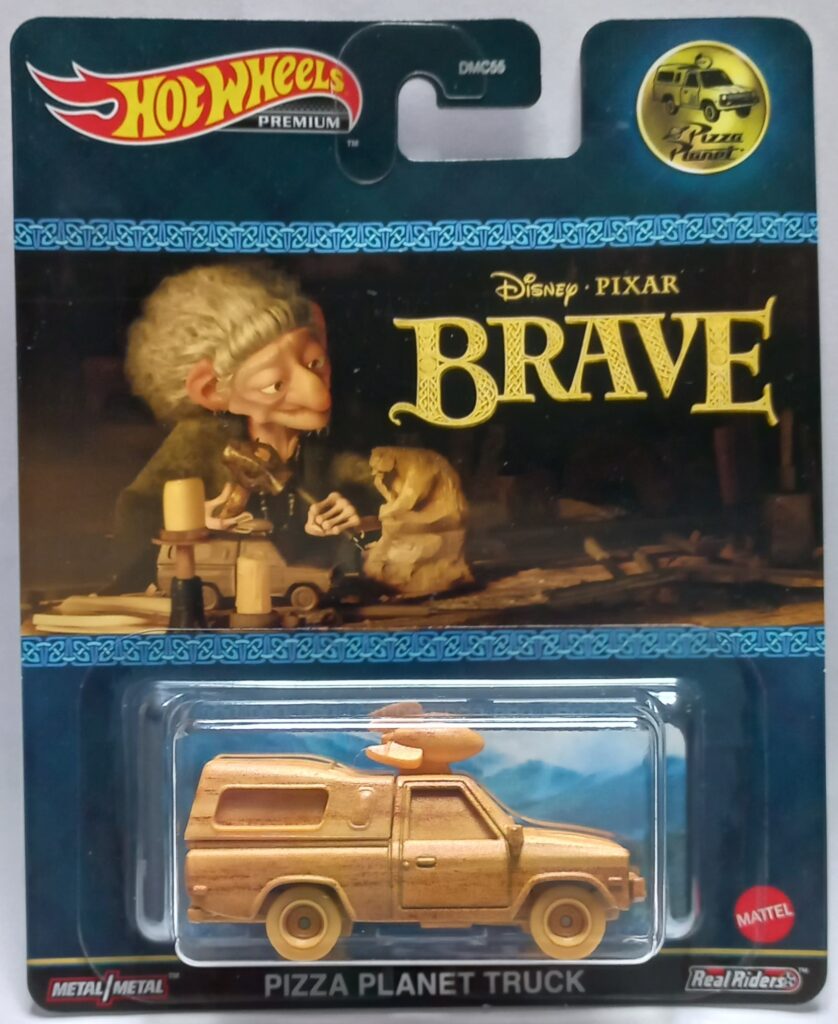 O Modelo que faz parte da coleção desta matéria, surge com o acabamento simulando madeira, e este conceito tem uma razão de ser, ele foi inspirado no modelo que a Bruxa da Animação Valente, que é ambientado na era medieval, esculpe em uma das cenas do filme, e para aqueles que não sabem ou não acompanham, já é uma tradição dentro do Estúdio de Animação Pixar, introduzir em seus filmes os chamados Easter-Eggs, que na tradução popular quer dizer SEGREDOS ESCONDIDOS, e neste caso já indicava que o veículo surgiria em um filme a ser lançado posteriormente, a Bruxa estava esculpindo o Pizza Planet Truck em madeira, e este modelo só apareceria em uma das edições de Toy Story que estrearia anos depois.