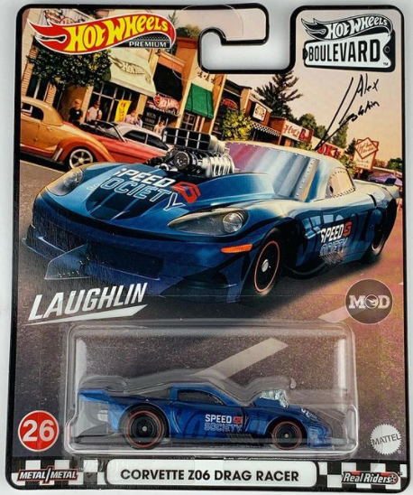 Este modelo representa o modelo de Arrancadas Corvette Z06 que foi pilotado pelo piloto de NHRA Alex Lauglin. Se notarem na parte superior direita do blister tem um autógrafo do piloto, e na parte inferior logo abaixo da imagem do carro a inscrição LAUGLIN.