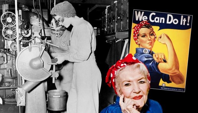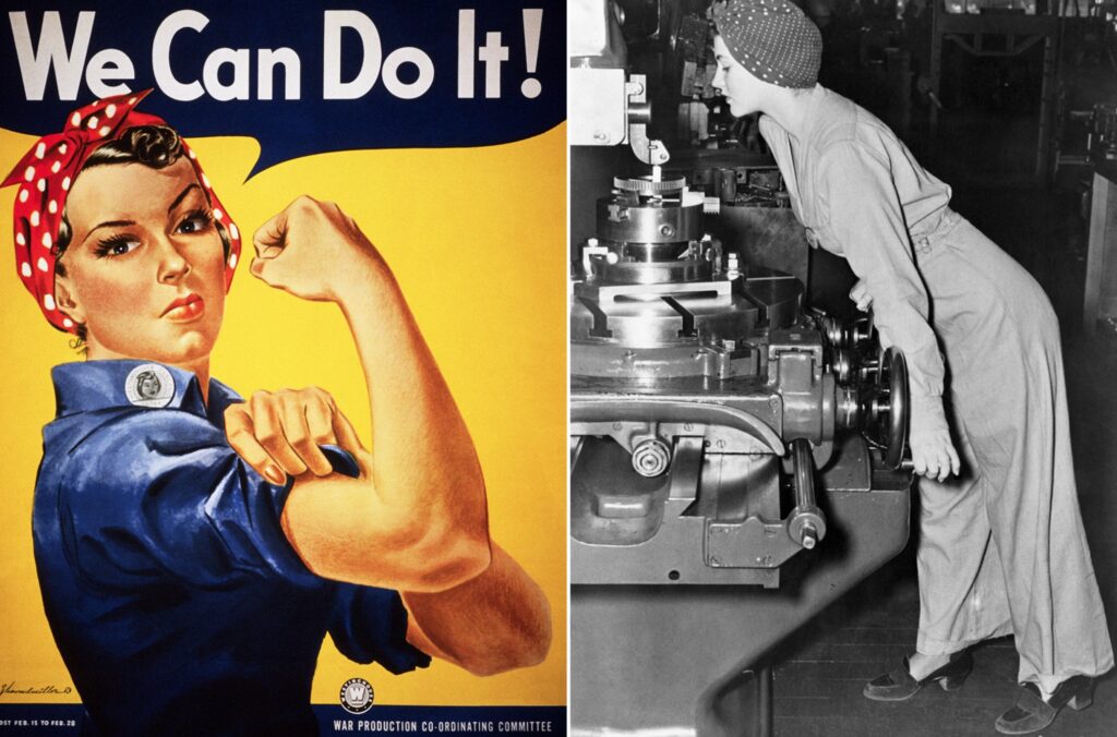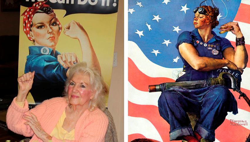 A Figura da Rosie, a Rebitadeira, trajada com o seu macacão de serviço, sempre com seu lenço na cabeça (Muitas vezes vermelho de bolas brancas), maquiadas, mantinham o toque feminino nas fábricas.