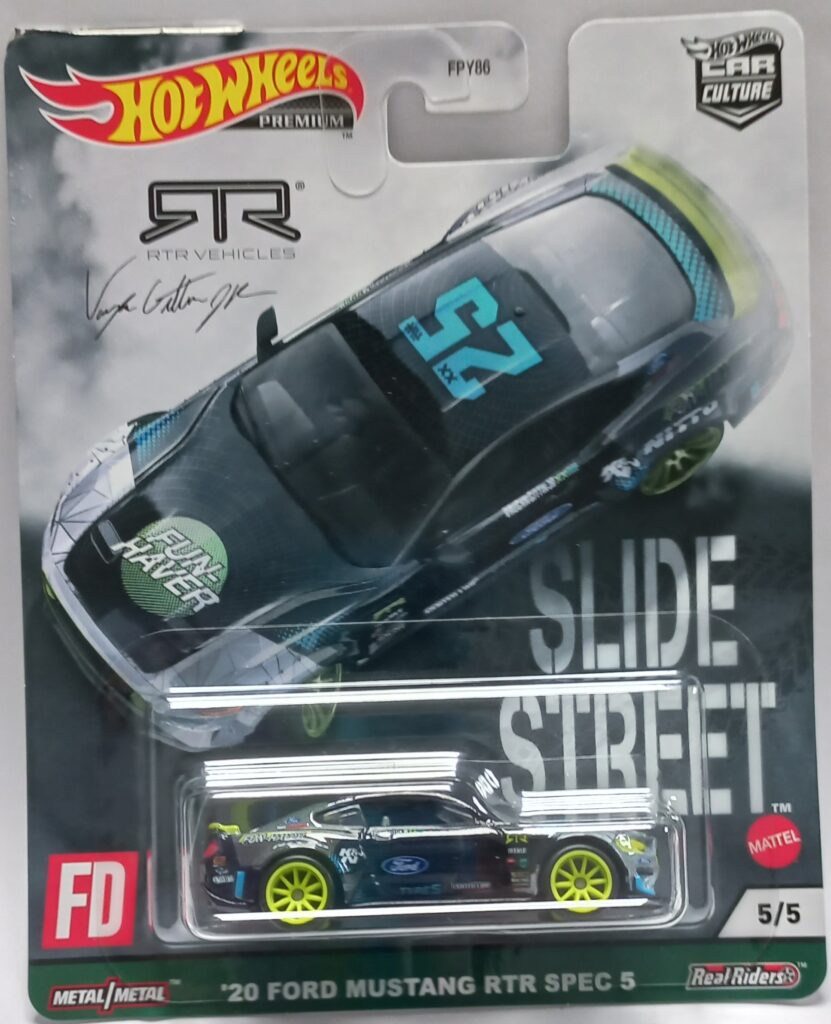 20 FORD MUSTANG RTR SPEC 5 este modelo estreou no ano de 2021 nesta própria coleção a Série Collectors Hot Wheels Car Culture Slide Street e esta versão na escala 1/64 mais um vez foi uma criação do Designer Master Hot Wheels Mark Jones.